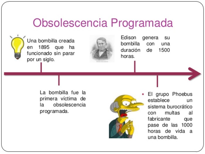 • Obsolescencia planificada: cuando, a la hora de crear un producto, se estudia cual es el tiempo óptimo para que el producto deje de funcionar correctamente y necesite reparaciones o su sustitución sin que el consumidor pierda confianza en la marca, y se implementa dicha obsolescencia en la fabricación del mismo para que tenga lugar y se gane así más dinero.