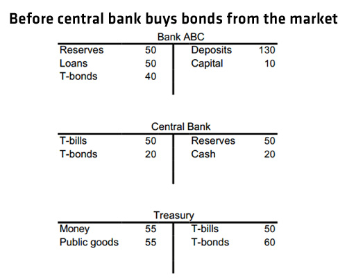 Como pueden ver, los activos del Banco ABC consisten en 50 reservas en el banco central, 50 préstamos y 40 bonos. El balance del banco central tiene activos de 70 T-bonds y T-bills, pero contra pasivos de 50 en reservas (las mencionadas reservas de los bancos) más 20 de billetes y monedas en circulación-lo que solemos llamar dinero.